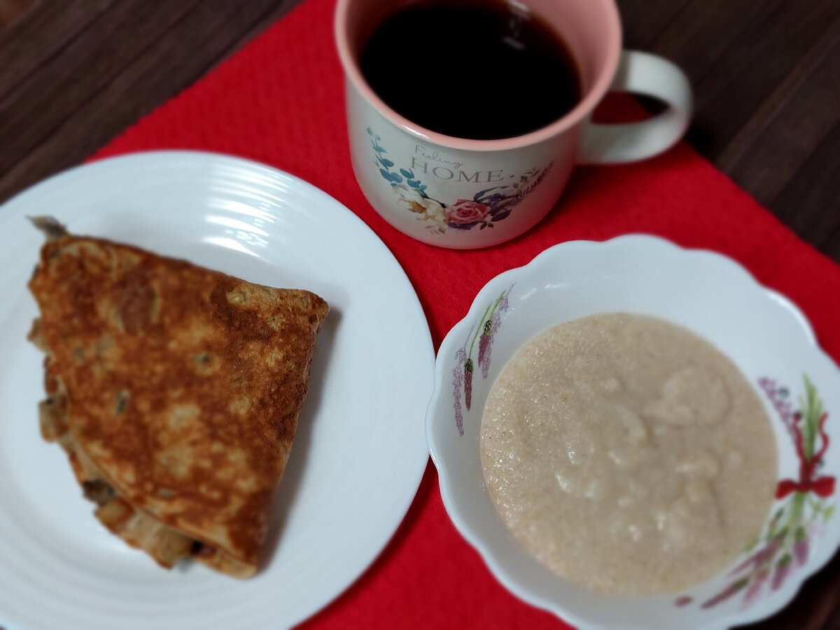 Блин на изоляте с шампиньонами, каша - отрубяша, кофе черный.