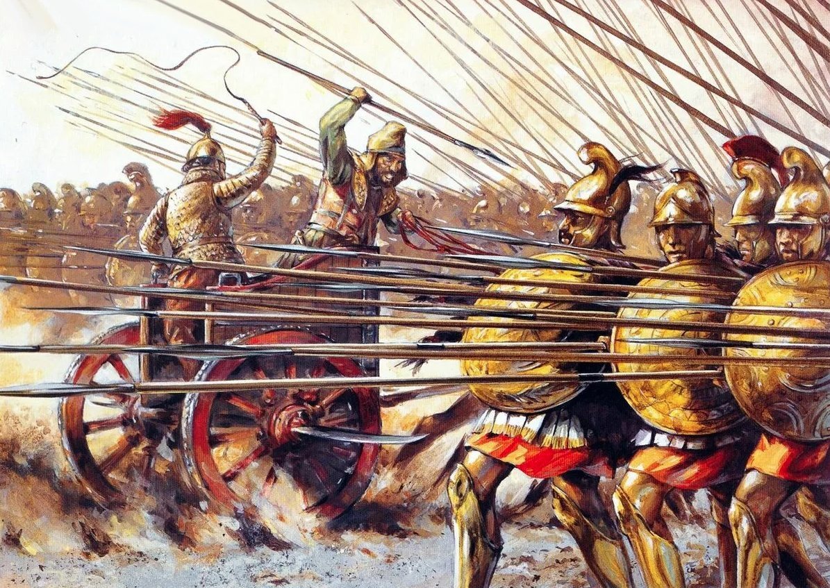 Колесницы использовали почти все древние цивилизации: ассирийцы с их помощью основали свою империю, персы ими ее защищали, китайцы объединили государство и отражали набеги варваров-кочевников с севера. И даже Израильское царство имело в воем распоряжении сотни боевых колесниц, что позволяло ему сохранять свою независимость до поры, до времени. Но больше всего их эффективным применением славились индоевропейцы, которые завоевали огромные территории, хотя повсеместно находились в меньшинстве. Их дальние потомки кельты в свое время давали жару, отбив колесницами не одно римское наступление. 1 октября 331-го года царь Персидской империи из династии Ахеменидов Дарий III наконец-то добился, чего хотел. Он сумел встретить македонское войско на большой плоской равнине, наилучшим образом подходящей для действия больших масс восточной кавалерии. С численным преимуществом, по крайней мере, два к одному, он принял решение дать бой вражеской армии. Сражение произошло около селения Гавгамелы, находя
