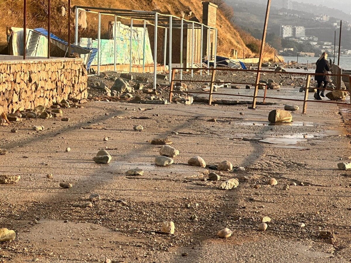 В Крыму из-за страшного урагана, обрушевшегося на полуостров вчера ночью, пострадали набережные Мисхора, Алупки, Фороса, Гаспры. В Кореизе сильно повреждена набережная Русалка. Смыты перила, фонари, скамейки, намыто много гальки. Порядка 500 сотрудников коммунальных служб задействованы в уборке Ялты. Алупка после бури. На пляже "Лягушка" штормом разбито летнее кафе. Фото: Telegram-канал Янины Павленко
