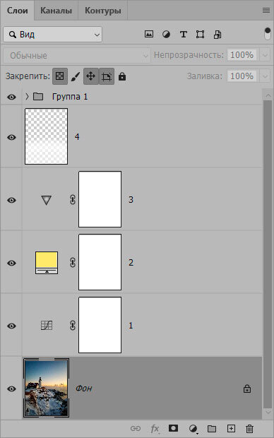 В результате обработки фотографии, я получил в слоях вот такую картинку. Как получилось то, что мы с Вами видим сейчас в фотошопе? Программа берет второй снизу слой под номером 1, накладывает его на самый нижний слой, в нашем случае фоновый и получает результирующую картинку. На эту картинку накладывается следующий слой под номером 2. Получаем результат наложения. На получившуюся картинку накладывается следующий слой под номером 3. Получаем результат наложения. И так далее, все вроде просто. Необходимо иметь ввиду, что при наложении, конечно, учитываются режимы наложения, непрозрачность и другие параметры слоя. Но, как только дело доходит до слоя, который находится в группе, картинка начинает меняться. И здесь нас ждет «засада». Далее продолжение наложения слоев может происходить по 2-м вариантам. Если у