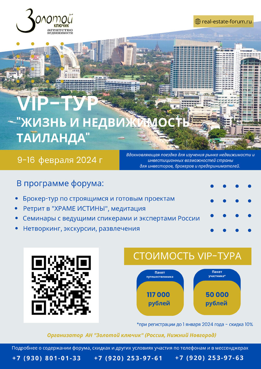 VIP-ТУР «ЖИЗНЬ И НЕДВИЖИМОСТЬ ТАИЛАНДА» ПРОЙДЕТ 9 ПО 17 ФЕВРАЛЯ В КУРОРТНОМ ГОРОДЕ ПАТТАЙЕ. Бизнес-поездку в южно-азиатскую страну второй раз организует нижегородское агентство недвижимости «Золотой ключик» совместно с крупными застройщиками, реализующими свои проекты в королевстве. Участников ждет насыщенная программа, содержащая экскурсии по новостройкам и общение с девелоперами, обучающий семинар и культурно-развлекательные мероприятия. По словам организаторов, цель Форума – личное знакомство россиян с жилищным рынком иностранного государства, налаживание деловых связей с представителями местного риэлторского сообщества, изучение нюансов проведения сделок с дальнейшей перспективой организации продаж жилых объектов Таиланда. Ольга Миронова, основатель АН «Золотой ключик», организатор Форума: