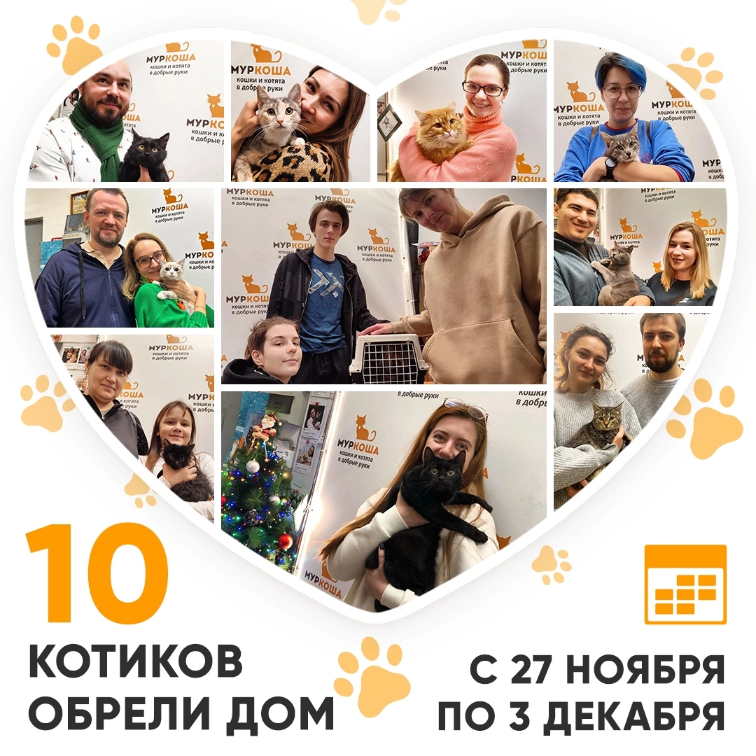 Друзья! Сегодня среда, и мы, как обычно, подводим итоги работы «Муркоши» за прошедшую неделю! Кто же стал счастливым выпускником Центра помощи кошкам «Муркоша» с 27 ноября по 3 декабря 2023 года? 😺 🥳 Итак, за прошедшую неделю домашними и любимыми стали 10 котиков! 1. Кошка Сержиу, 1.4 года Сержиу, первые шаги в новом доме. 🥰 2. Котенок-мальчик Бенцион, 6 месяцев Первый привет из дома: «Пока что осваивается и всего боится, стараемся не шуметь, но его смущает любой шум. Первый день почти не кушал, сухого корма съел меньше 5-10 граммов, но вчера дали пакетик жидкого и ему котик порадовался и почти весь скушал». ❤️ 3. Котенок-мальчик Гудрон, 4 месяца (познал в одну семью к нашему выпускнику Моргану 😻) Первый привет из дома: «Адаптация на все 5+👍 По приезду прятаться не стал, прошёлся, осмотрелся))) а потом увидел Моргана иии.... стал пытаться нападать😁 так забавно выглядело как маленький комочек скачет боком)) оказался парень не из робкого десятка)) вчера уже с Морганом начал дружит