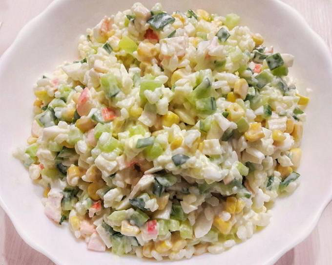 Дорогие мои, сегодня я хочу рассказать вам о рецепте всем известного салата! До учебы в университете я готовила данный салат совершенно по-другому. Он состоял из крабовых палочек, кукурузы, капусты и огурцов с майонезом. Но в университете я попробовала другой вариант такого салата, теперь готовлю его только по этому рецепту! Ингредиенты: Берем глубокую тарелку или контейнер, куда нарезаем крабовые палочки, огурцы и высыпаем кукурузу, предварительно слив с банки жидкость. Добавляем сваренный и подсушенный рис, майонез и соль. Перемешиваем. И вот готов наш вкусный салатик !