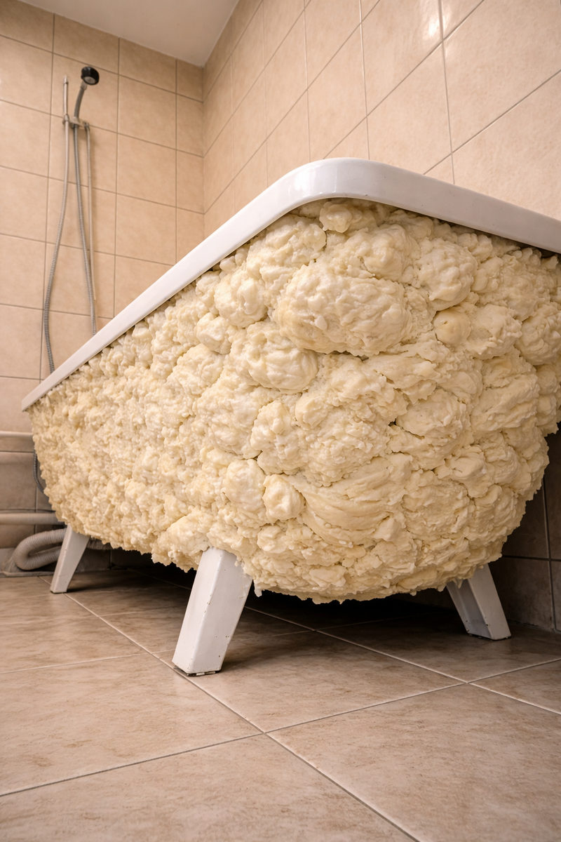 - Делайте это по кругу, словно обматывая ванну большими пенными нитями, обязательно соединяя уже нанесенный слой с последующим; начинайте снизу, с бортиков, и постепенно поднимайтесь вверх, к днищу купальни – естественно, не запенивая сливные отверстия. Ни в коем случае не торопитесь, не оставляйте между «нитями» никаких промежутков, делайте всё ровно и аккуратно.