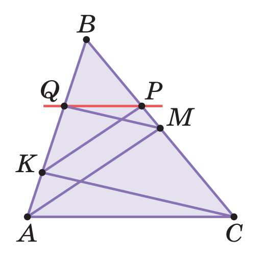 Задача: На сторонах AB и BC треугольника ABC выбрали произвольные точки M и K. Через них параллельно прямым CK и AM провели прямые, которые пересекли стороны AB и BC в точках P и Q. Докажите, что прямые PQ и AC параллельны. ©Математическая Вертикаль. Учебное пособие для общеобразовательных организаций. Автор: М.А.Волчкевич. Решение: Рассмотрим △ABM и △KBP: ⇒ △ABM ~ △KBP по I признаку подобия треугольников ⇒ BK/AB = BP/BM ⇒ BP = BM * BK/AB. Рассмотрим △QBM и △KBC: ⇒ △QBM ~ △KBC по I признаку подобия треугольников ⇒ BM/BC = BQ/BK ⇒ BQ = BM * BK/BC. Рассмотрим △ABC и △QBP: ⇒ △ABC ~ △QBP по II признаку подобия треугольников ⇒ все соответственные углы треугольников равны ⇒ ∠BQP = ∠BAC. Если при пересечении двух прямых секущей, соответственные углы равны, то прямые параллельны ⇒ QP∥AC. Что и требовалось доказать. Задача решена.