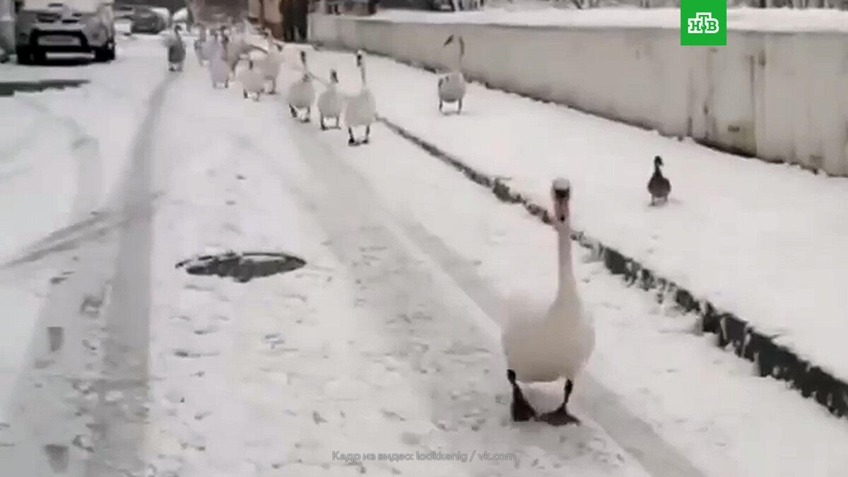 Жители Балтийска сняли на видео идущих строем по городу лебедей