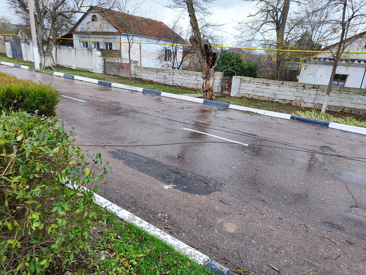 Огромное количество оборванных проводов, валяются прям на дороге. Часть улицы обесточена, часть со светом как мы. Повалены или поломаны деревья. Много сорванных крыш частично.