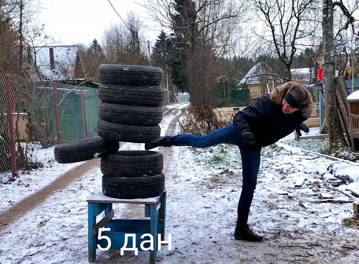 Год назад один человек написал мне в комментариях, что можно из выбивания шин сделать дан-тест. Типа на первый дан точным и сильным ударом сбивать первую шину, на второй дан выбивать из пирамиды вторую. Мне идея понравилась, но не верилось самому, что можно из пирамиды выбить третью, а уж тем более четвертую шину.