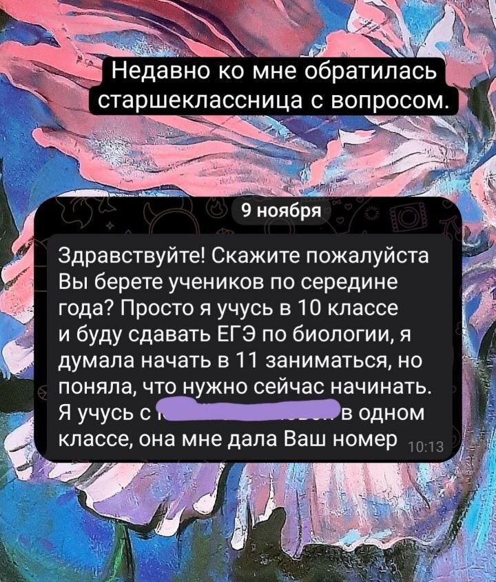 Недавно ко мне обратилась старшеклассница, ученица десятого класса. Во-первых, она умничка! Умничка не потому, что написала мне. Она умничка, потому что почувствовала, что ей не хватает знаний и навыков и не стала это замалчивать, думая, что есть еще много времени, и всё успеется. Девочка посоветовалась с родителями и, получив их одобрение, стала искать себе репетитора, советуясь с одноклассниками. Когда она написала мне, я сначала расспросила о целях: какое направление, какой вуз она выбрала, знает ли она какой там проходной балл, проводили или нет тестирование в школе, почему она решила обратиться и тд. Никаких прогнозов заранее! Никаких прогнозов заранее я не делаю. Нельзя так навскидку сказать сколько раз в неделю нужно заниматься ребенку. Это очень индивидуально. Я предлагаю пройти тестирование и пробный урок. Только после этого я уже могу определиться и сориентировать девочку и родителей. Результаты тестирования я обязательно отправляю родителям. Надо понимать, что родител