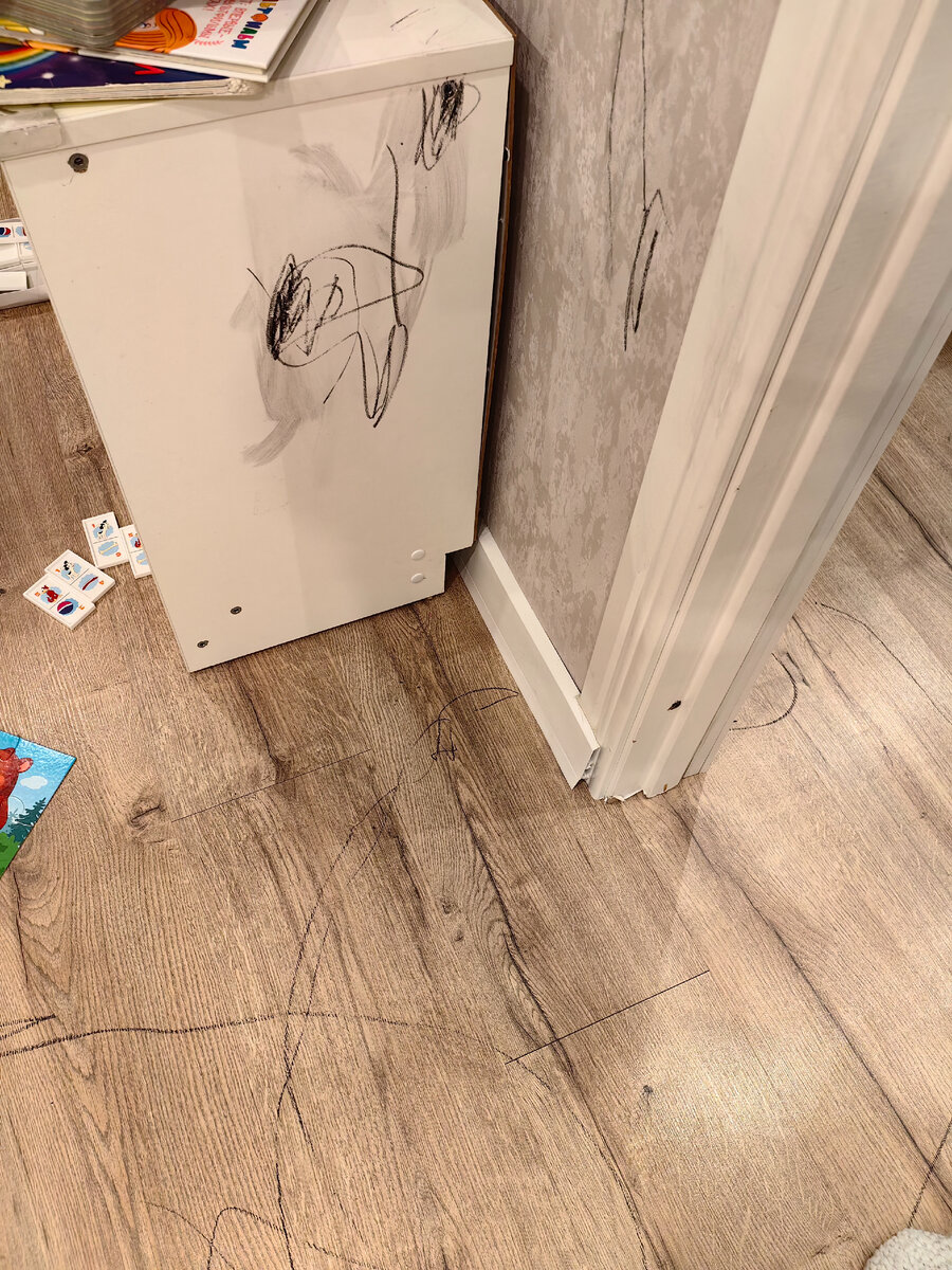 Конечно же, отмывали эти художества мы совместно с сыном. Хоть он давно и знает, что рисовать можно только на бумаге и в раскрасках, но, видимо, вдохновение оказалось слишком непреодолимо.