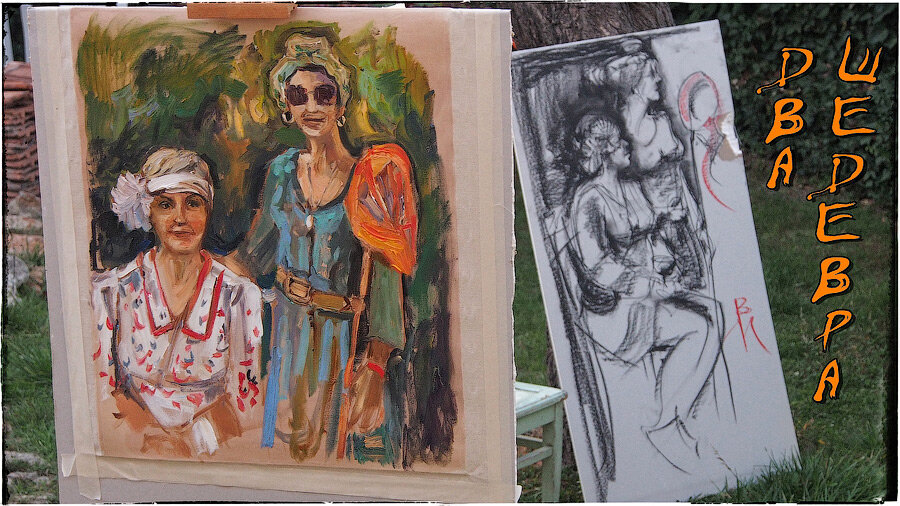 Год назад мы устроили небольшой, но очень бурный пленэр во дворике, в ходе которого Лена, расхрабрившаяся от вина и намечавшая показательный этюд, вдруг вместо пейзажа принялась писать парный портрет Валеры и Андрея, наряженных по такому случаю в случайный реквизит. Получилось, конечно, не похоже, но очень разухабисто, весело и памятно. Оля в тот раз смонтировала из кусочков видео и фотографий очень смешной и трогательный фильм, который мы все неоднократно пересматривали.
