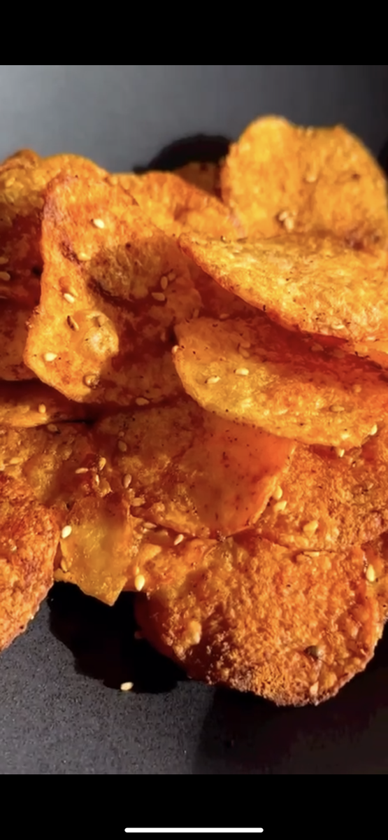 😋 Домашние чипсы Домашние картофельные чипсы в духовке получаются такими же хрустящими и вкусными, как из упаковки, но вы точно будете знать, что приготовлены чипсы из натуральных продуктов, поэтому их смело можно есть как взрослым, так и детям. 📝 Вам понадобятся: • картофель – 5 шт • оливковое масло – 4 ст.л • соль – 1 ч.л • перец – 1 ч.л • молотый чеснок – 1 ч.л • перец – 0,5 ч.л • кунжут – 1 ч.л