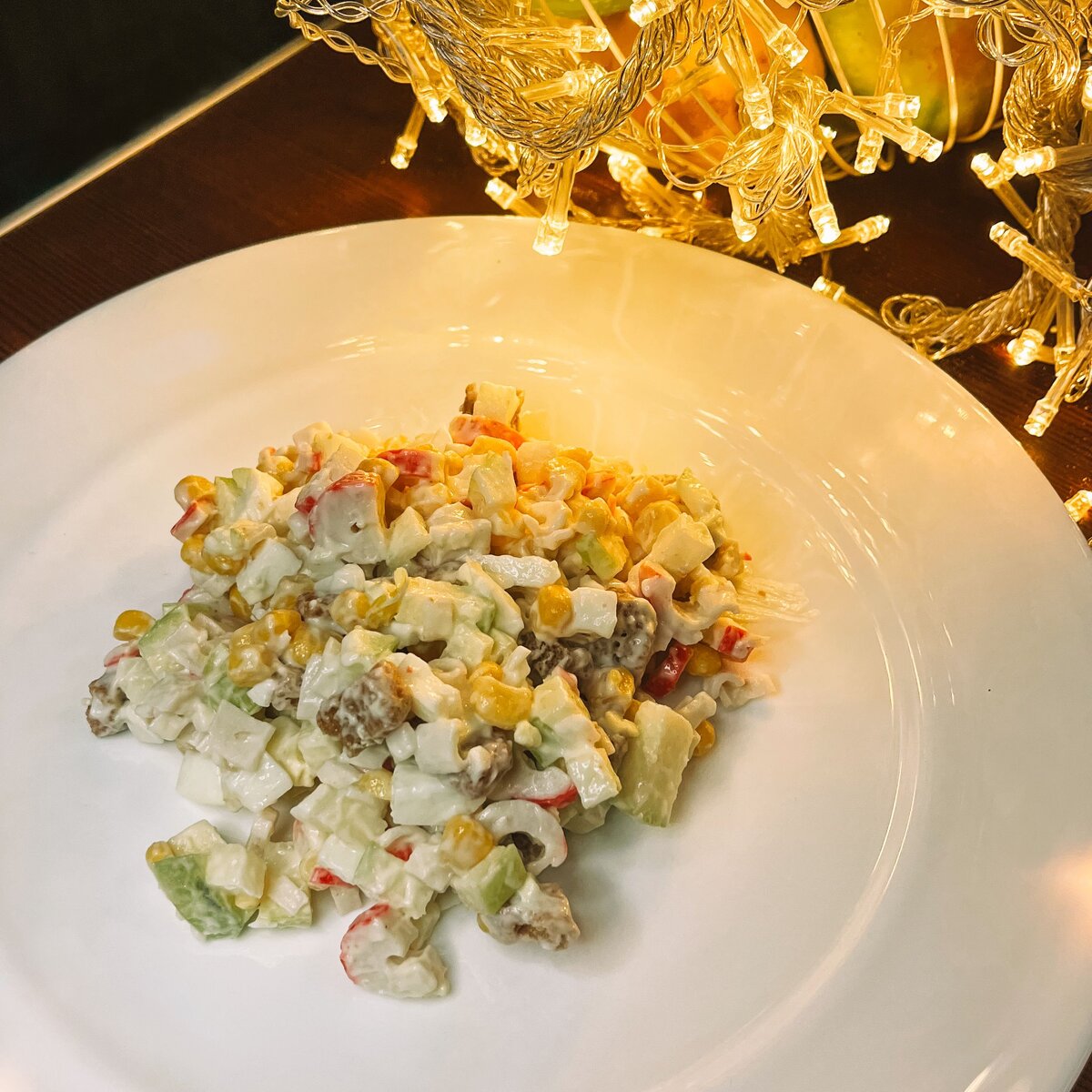 Привет, читатель! На носу уже декабрь и мы уже во всю выбираем что же готовить к новогоднему столу. Потому весь декабрь я буду готовить для вас интересные рецепты к новогоднему столу! И сегодня предлагаю вашему вниманию привычный салат с крабовыми палочками, но совершенно но новому! Нам понадобится: Первым делом нужно отварить яйца для салата. А пока варятся яйца, нужно нарезать кубиком крабовые палочки, яблоко (если кожура жёсткая, лучше её очистить) и яйца, когда они сварятся. В миску насыпаем кукурузу, к ней добавляем все нарезанные ингредиенты. Салат солим, заправляем майонезом (или греческим йогуртом с горчицей). Сухарики добавляем перед самой подачей, чтоб они не размякли. И салат готов! В комментариях поделитесь своими любимыми салатами с крабовыми палочками. И если приготовите этот салатик напишите, понравился ли вам он :) КБЖУ на 100г: Ккал 169 Б 6 Ж 4.5 У 25.8
