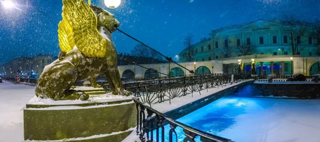 Описание Банковского моста Один из красивейших мостов Санкт-Петербурга обладает небольшими размерами: имеет один пролёт длиной — 25,2 м, шириной — 1,85 м. Его металлическое основание покрыто поперечными досками. Пролётное строение представляет собой сваренные из швеллеров две коробчатые балки, объединённые поперечными и продольными связями. В роли пилонов выступают чугунные рамы, перед которыми располагаются скульптуры крылатых львов. Восседающие на постаментах из чугуна изваяния служат не просто украшением моста — они маскируют цепи, прикреплённые к чугунным каркасам. Последние, в свою очередь, выходя из пасти животных, другим концом находятся в фундаменте под пьедесталами львов. Таким образом создаётся впечатление, что именно могучие львы удерживают мост зубами. Перила изготовлены из кованого железа, украшенного рисунком. Скульптуры Банковского моста Статуи крылатых львов, выполненные П. П. Соколовым, представляют собой несравненные образцы монументальной ампирной скульпт
