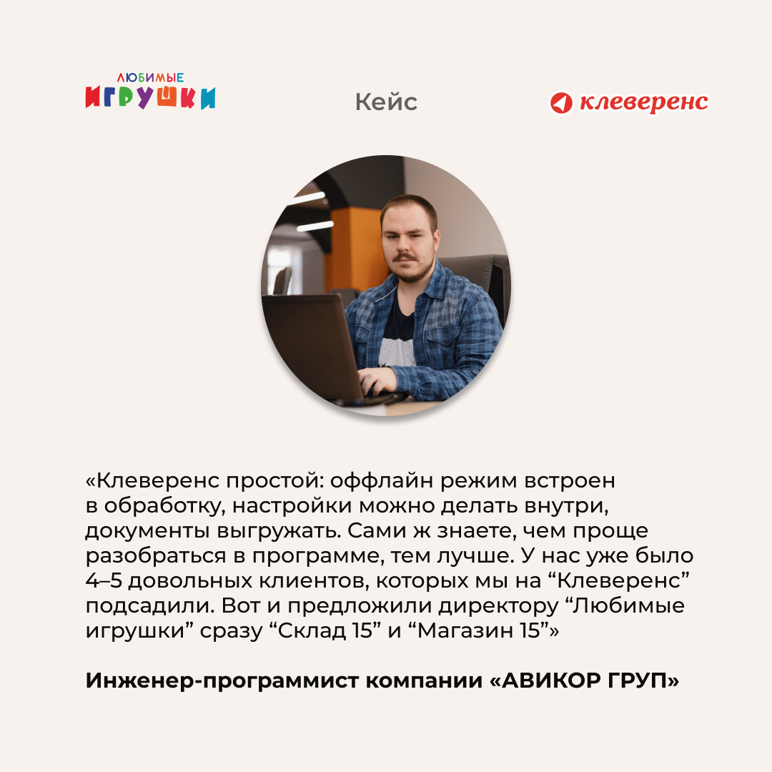 Мы давно уже работаем с «Клеверенс», предлагаем всем нашим клиентам этот софт. Потому что сравнивали с другими продуктами, так там оффлайн режим – это только внешняя обработка и в общем сложнее все процессы. А «Клеверенс» простой: оффлайн режим встроен в обработку, настройки можно делать внутри, документы выгружать. Сами ж знаете, чем проще разобраться в программе, тем лучше. У нас уже было 4–5 довольных клиентов, которых мы на «Клеверенс» подсадили. Вот и предложили директору “Любимые игрушки” сразу «Склад 15» и «Магазин 15».Установку быстро выполнили, по инструкции легко всё. И с программой уже можно было работать в течение дня. С нашей стороны только с обменом сложности возникли, мы обратились в техподдержку, нам помогли не только по продукции «Клеверенс», но и с нашими настройкам разобраться.
