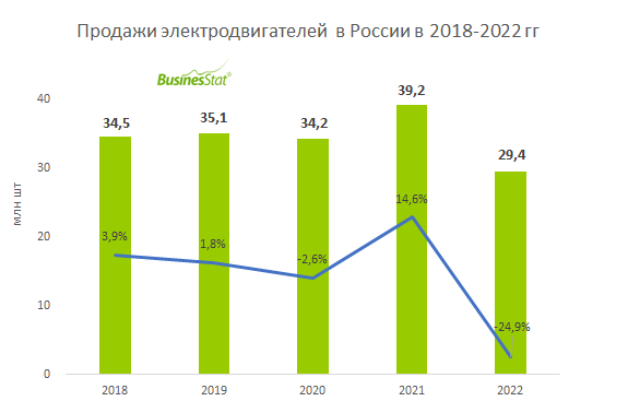 Продажи электродвигателей в России в 2022 г упали почти на 25% и составили 29,4 млн шт.
