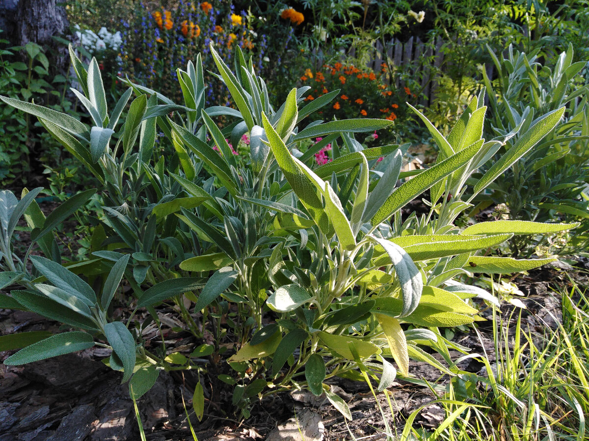 В декоративном огороде я высадила выращенные из семян шалфеи лекарственные сортов "Кубанец" и "Будь здоров", особенно мне понравились сочетания с розмарином и лавандой, с листовым салатом и шпинатной лебедой, с кервелем и тонколистными бархатцами. Посмотрите в галерее, как прекрасно сочетается серо-зеленая листва шалфеев лекарственных с бордовой зеленью или мелкой ажурной листвой ароматных трав. Лучший овощ-компаньон для шалфея лекарственного - морковь!