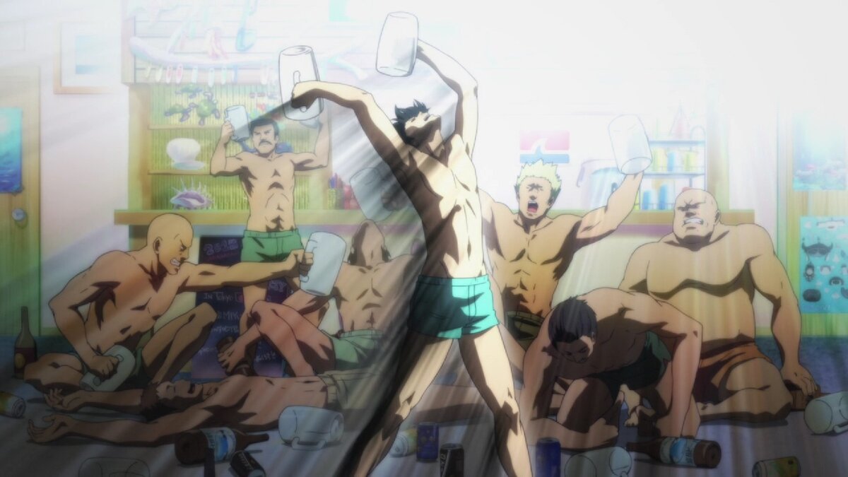 Вот приезжаешь ты учиться. Надеешься на приятное и светлое будущее, где ты грызешь гранит науки, а выходит, что твоя участь это выживать в промежутках между постоянным пьянство, в компании голых и накаченных мужиков. Хотя может такой поворот событий и лучше… В общем именно в такой ситуации и оказался наш главный герой Иори. Что же он выберет: перспективное будущее или суровое, но крайне приятное настоящее. Абзац моего мнения Давненько я так не смеялся с простой комедии. Этот приятный быт студентов, где много женщин, в нашем случае мужчин, алкоголя и веселья. Только они упустили несколько важных моментов студенческого быта: нет сражений с тараканами за еду, а как же недоедание и конечно куда делась бесконечная зубрёжка. Ну да ладно, я могу простить это авторам, может у японцев нет подобных проблем. Обзор аниме: Необъятный океан Персонажи Я не скажу, что они какие-нибудь супер проработанные и не забывающиеся, но они такие родные. Вот смотришь на них и понимаешь, в большинстве ситуаций ты