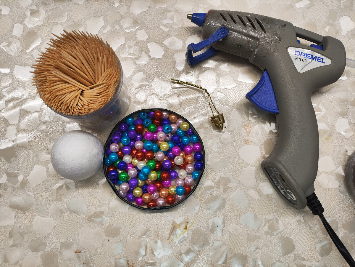 Как обычно дела откладывают на последний момент, но здесь такой возможности не предоставили. 😂 В родительский чат детского сада скинули сообщение о том, что нужно срочно, быстро, моментально.... (ну как всегда🙃) сделать шар на ёлку из вторсырья. Ну что же... Взгляд упал на зубочистки.... и... Понеслась. Приготовила инструменты и материалы, позвала помощницу и вперёд. 🦸 Для начала ломаем зубочистки на две части. Затем при помощи горячего клея, закрепляем бусины на зубочистке Далее в пенопластовую основу вставляем наши заготовки Потом между бусины вставляем половинки зубочисток остриём наружу, крепим петельку и готово! Вот такая "Недотрога" у нас получилась😉