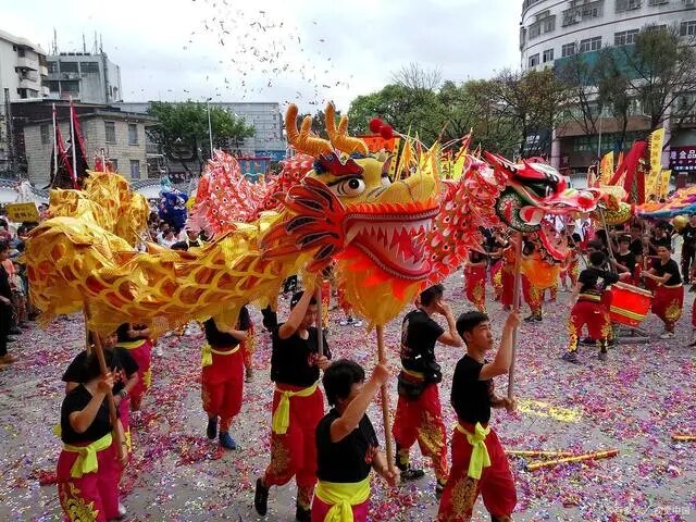 Танец дракона, традиционный китайский народный танец, имеет долгую историю и глубокое культурное наследие. Оно возникло из жертвенных ритуалов древних предков и стало уникальной формой народного искусства, объединившей традиционные боевые искусства, танцы, музыку и другие элементы. Танец дракона широко распространен среди людей, его не только исполняют во время традиционных фестивалей, таких как Праздник Весны (Китайский Новый Год) и Праздник середины осени, но и часто используют на храмовых ярмарках, свадьбах и других мероприятиях, чтобы принести удачу и процветание. В форме представления танец дракона возглавляется головой дракона, за ней следует тело дракона и хвост дракона, а исполнитель держит жезл дракона, чтобы показать ловкость и величие дракона, изменяя построение, темп и движение. Танец дракона исполняется различными способами, включая перекатывание, прыжки, извивающиеся и другие движения, а также различные формы танцевальных шагов и смены формирований. Хореография этих движ