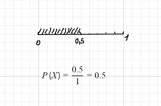 г) х ≥0,9. а) х<0,5. Вероятность наступает, если точка, расположенная левее точки 0,5, что составляет 1/2 отрезка [0;1]. б) х > 0,7. Вероятность наступает, если точка расположена правее точки 0,7, что составляет 0,3 от отрезка [0;1]. в) х ≤ 0,3. Вероятность наступает, если точка расположена левее точки 0,3, что составляет 0,3 от отрезка [0;1]. г) х ≥0,9. Вероятность наступает, если точка расположена правее точки 0,9, что составляет 0,1 от отрезка [0;1]. Ответ: а) 0,5; б) 0,3; в) 0,3; г) 0,1