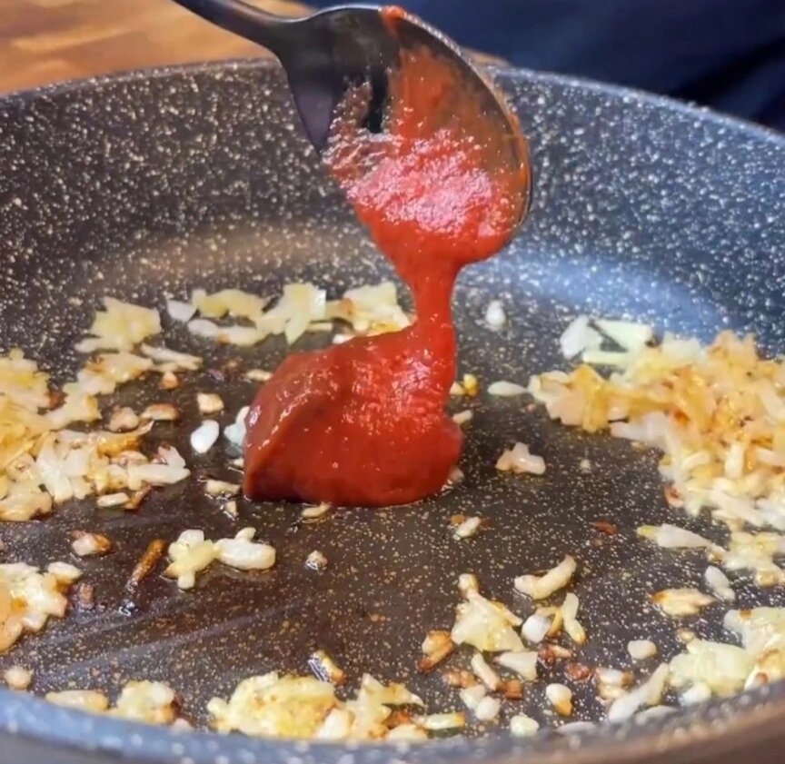 3. Нарежьте лук кубиками и обжарьте его в сковороде вместе с томатной пастой.