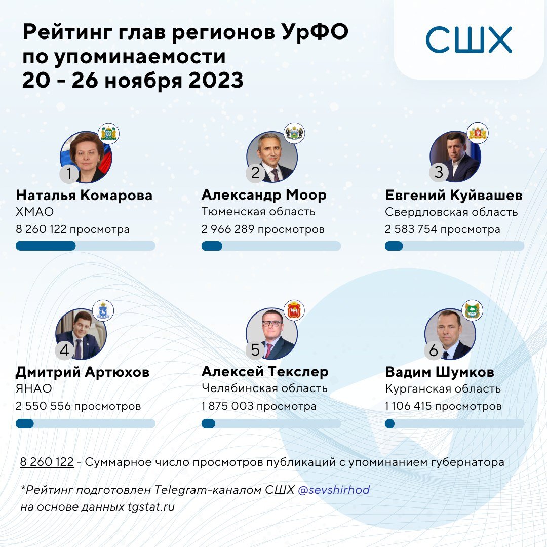 Кратно подняли собственную цитируемость все уральские губернаторы за счет проведения Дней регионов Урала на международной выставке-форуме «Россия». Рекордсменом стала глава Ханты-Мансийского автономного округа Наталья Комарова, которая собрала 8 260 122 просмотра. У единственной женщины-губернатора на этой неделе и больше одного ключевого повода: часть из 1 212 публикаций про Комарову и форум «Россия» были посвящены ее неоднозначному предположению про замену губернаторов нейросетями, которое сразу стало мемом.