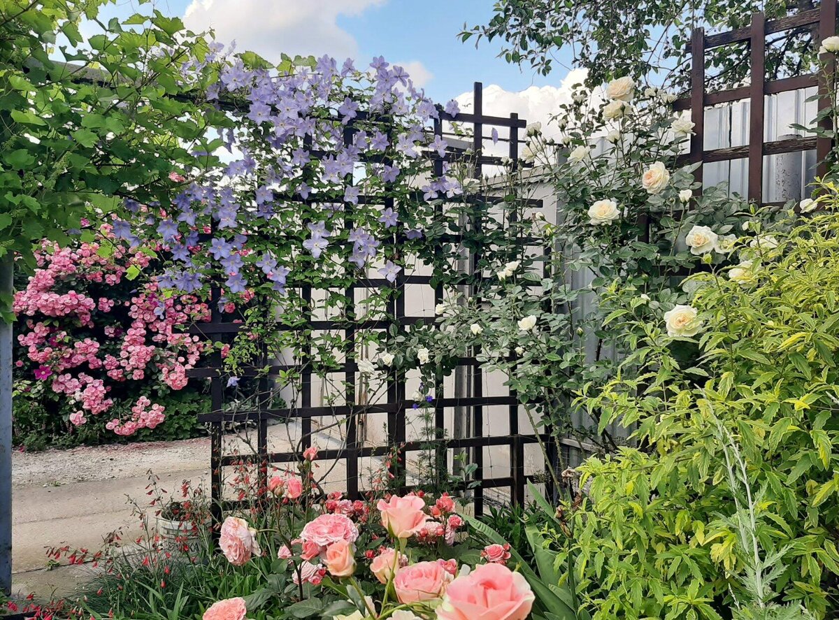 Возле входа на участок самое знойное место в моём саду, там выживают только сильнейшие. В моём случае, это розы и их компаньоны. Если у Вас есть такие солнечные места на участке, то я рекомендую только яркие теплые оттенки, никакие «голубые» розы там вас радовать не будут. Удивительно, но даже не имея опыта, розы по цвету я сразу подобрала удачно, сорта этих тружениц не «пекут» лепестки на жаре. Да, у меня есть некоторые претензии по стойкости к болезням по нескольким сортам, но за способность выдерживать наши температурные рекорды, я готова им это простить. Вот, несколько общих планов. Отдельно хочется отметить розу Jet Set (Джэт Сэт), и не особо махровый цветок и слабая цветоножка, которая не держит цветок, и склонность к ЧП, но за обильность и практически непрерывное цветение, я ей это всё прощаю. Другая роза, о которой мне хочется рассказать это сорт Jalitah (Джалита) несмотря на то, что в моём саду растет около 80 сортов роз, гости всегда обращают внимание именно на эту красавиц