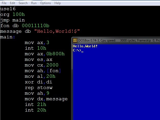 В строке 18 мы при помощи функции 35-ть 21-го прерывания получаем вектор этого прерывания и сохраняем его в переменной [old_21] (строки 20,21), затем, с помощью функции 25-ть 21-го прерывания устанавливаем вектор на нашу подпрограмму "int21", строки 22, 23, 24. В заключение при помощи прерывания 27h мы сохраняем в памяти резидентную часть нашей программы, эта та часть кода, которая выше метки "main". Теперь если скомпилировать этот код при помощи компилятора fasm в DOS или его эмуляторе, то в памяти компьютера появится резидент, который будет подменять любую строку выводимую с помощью функции 9 21-го прерывания, но чтобы увидеть как это работает, нам надо написать еще одну маленькую програмку, которая обновляет экран в синем цвете и выводит традиционное, среди программистов, привествие "Hello, World!". Эту программу я назвал "Hello.com".