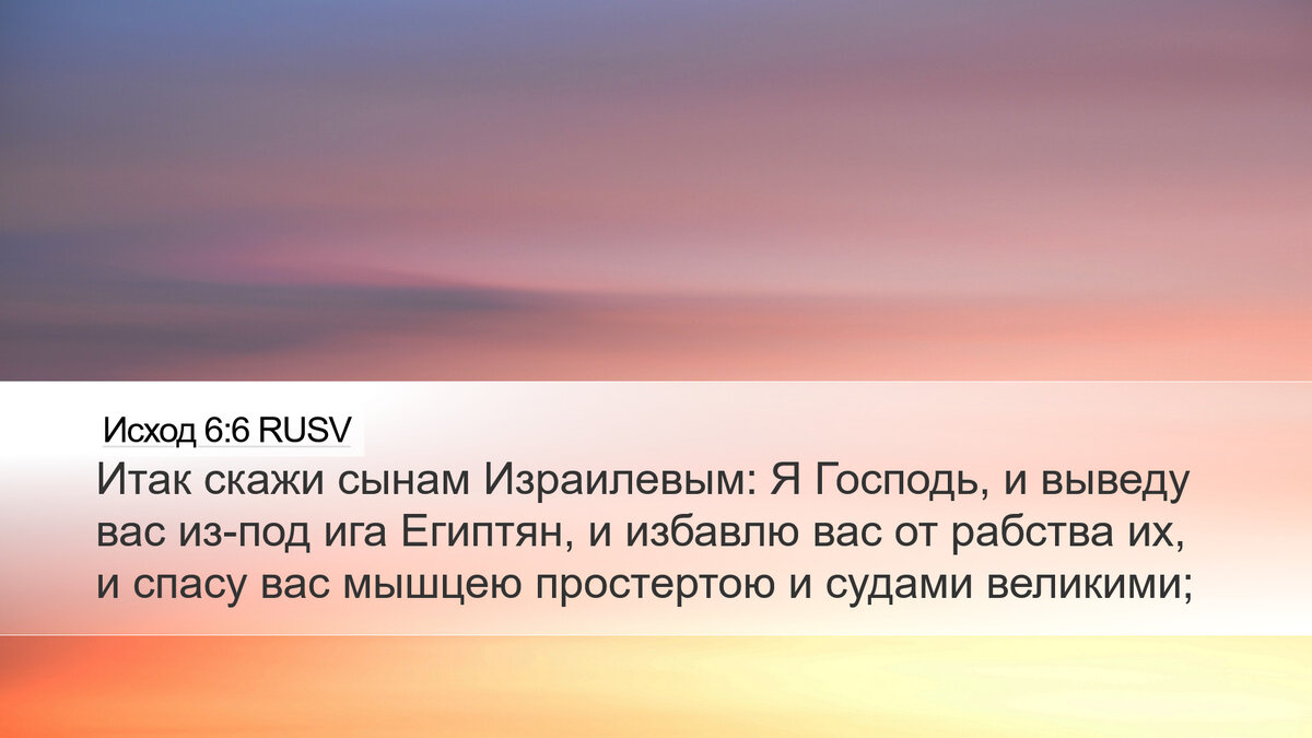 В стихе 6 Бог велит Моисею объявить Его имя народу, чтобы они точно знали, кто избавляет их. В тот момент в истории им нужно было ещё многое узнать о Господе; вероятно, Божье объявление не придало им той уверенности, на какую можно было рассчитывать. Фактически, Бог сказал, что одной целью избавления было то, что впоследствии они узнают, «что Я Господь, Бог ваш, выведший вас из земли египетской, из-под ига египетского» (ст. 7).