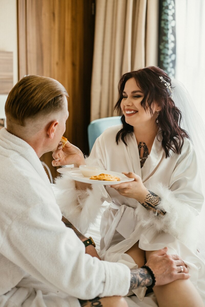 Выходной день Аня и Сергей решили провести дома, наслаждаясь обществом друг друга. Утром Аня проснулась первой и решила приготовить любимому сюрприз. Она надела полосатый розовый халат и на скорую руку испекла блинчики с вареньем - любимое лакомство Сергея. Аккуратно расположив завтрак на подносе, девушка отнесла его в спальню и разбудила возлюбленного нежным поцелуем. Сонный Сергей улыбнулся и сел в кровати, прислонившись к изголовью. Аня ласково накинула ему на плечи теплый халат и стала с улыбкой потчевать блинчиками, поливая их вкусным вареньем. Сергей с удовольствием принимал угощение из её рук, наслаждаясь каждой секундой такого милого утра вдвоём. А у Ани от счастья светились глаза – ей очень нравилось баловать любимого такими приятными сюрпризами.