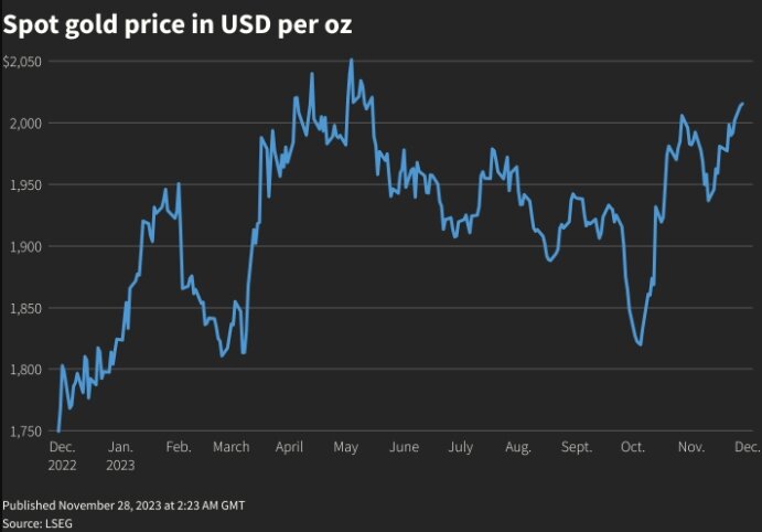 Золото достигло 6-месячного пика на фоне падения доллара, прогноза, что ФРС приостановила повышение ставки Золото стабилизировалось после достижения шестимесячного пика во вторник, поскольку ожидания окончания цикла повышения процентных ставок Федеральной резервной системой США сдерживали рост доллара и доходности облигаций. Цена на спотовое золото практически не изменилась и составила 2014,12 доллара за унцию к 04:12 по Гринвичу, достигнув самого высокого уровня с 16 мая. Фьючерсы на золото в США с поставкой в декабре выросли на 0,1% до 2 014,20 долларов за унцию. График Reuters "Более низкая доходность облигаций и ставки, которые ФРС может сократить раньше, чем предполагалось изначально, безусловно, помогли золоту засиять", - сказал старший аналитик City Index Мэтт Симпсон. Индекс доллара достиг самого низкого уровня с конца августа по отношению к своим конкурентам, что сделало золото менее дорогим для держателей других валют. Доходность 10-летних казначейских облигаций колебалась вб