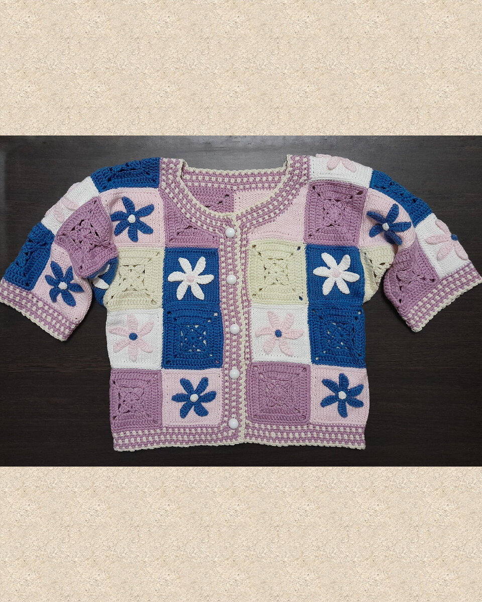 Наткнулась в интернете на этот жакет в старом японском журнале. И так он мне понравился: и сочетание цветов и сама задумка, что решила его связать. Да, я прекрасно понимала, он не ко всему и не всем подходит, и что его сложно с чем-то сочетать, но желание было сильнее здравого смысла. Долго я собиралась вязать этот жакет. Я всегда стараюсь довязывать то, что начинаю вязать. Могу параллельно что-то вязать, а этот жакет из разряда так называемых долговязов. Начинала вязать и потом откладывала пару раз: то вдохновение уходило и не приходило, то нитки закончились. Я считаю, что очень важно вязать с настроением и получать от процесса вязания удовольствие. Подбирала нитки максимально приближенные к цветовой гамме изображенного на фото жакета. Для вязания я выбрала нить YarnArt Baby Cotton, цвета — белый, молочный, нежно-розовый, розовая сирень, синий джинс, состав: 50 % хлопок, 50 % акрил, вес 50 г, длина 165 м. Нить гладкая шелковистая, что немаловажно гипоаллергенная, приятная на ощупь. П