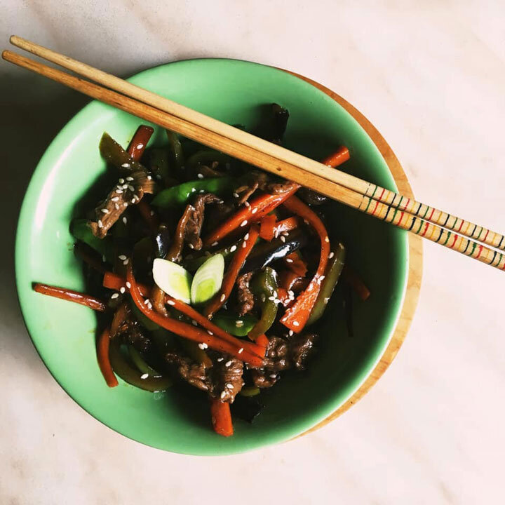 Вок - хороший способ приготовления мяса и овощей. Они жарятся в сковороде с минимальным количеством масла, сохраняя максимум полезных свойств. Блюда, приготовленные в воке, всегда имеют насыщенный вкус и аромат. Главное при приготовлении - заранее подготовить все компоненты и обжаривать их небольшими порциями, постоянно помешивая. Мясо обжаривается первым, за ними - овощи в порядке твердости. ✔ 500 г постной говядины; ✔ 1 морковь; ✔ 1 баклажан; ✔ 1 болгарский перец; ✔ Зелёный горошек – 100 г; ✔ Кунжутное масло – 25 г; ✔ Соевый соус – 50 мл; ✔ Перец острый; ✔ Кунжут – 25 г. Для более азиатского вкуса, можно добавить имбирь, чеснок, кинзу. Режем мясо тонкими кусочками, овощи - соломкой. Поэтапно обжариваем все компоненты с небольшим количеством соевого соуса и кунжутного масла, соединяем все вместе, добавляем зелёный горошек, ещё держим 1-2 минуты и раскладываем по тарелкам. Посыпаем жареным кунжутом, украшаем луком-пореем. КБЖУ на 100 г – 165,7/14,1/10,2/4,1. + 2 фото От наших друзей: