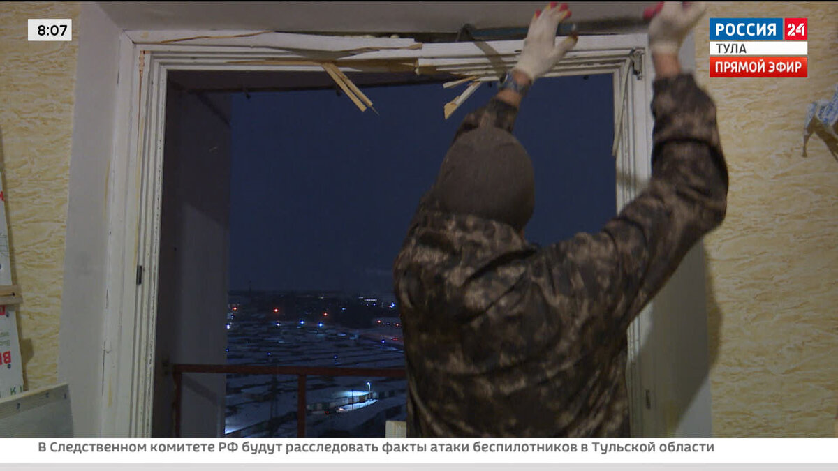 Яркая вспышка, осколки стеклопакетов и обломки оконных рам, сыпятся на придомовые площадки. Момент попадания беспилотника в многоэтажку на улице Хворостухина в Туле запечатлели камеры наблюдения на соседних строениях. Это произошло около 4-х часов утра. Удар в жилой дом пришелся на высоте 12-го этажа. Квартира, в которой с семьей находился Виктор, оказалось в самом эпицентре удара, а сам он единственный, кому той ночью понадобилась помощь медиков. Об этом наш сюжет здесь. Виктор Панфилов пострадавший: Вот тут была супруга, вот видите направление взрывной волны, а на ней ни царапины, чудо просто. Дверь снесло, а я был в самой дальней комнате, мне осколок в ногу попал маленький, но там перебинтовали- пустяковый, ничего страшного. Специалисты взрывотехники, скорая, социальные работники и психологи прибыли на место уже через несколько минут. Сразу же все необходимые поручения сделал глава региона Алексей Дюмин. Жильцам, было предложено подождать окончания работы спецслужб в расположенном п