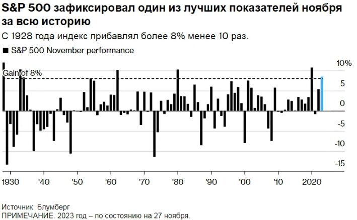 Чистая позиция по фьючерсам на S&P 500 теперь немного медвежья. Вынужденное закрытие коротких позиций все еще может поддержать рост в конце года. По мнению стратегов Citigroup Inc., ралли, которое позволило S&P 500 продемонстрировать один из лучших ноябрьских приростов за столетие, уже выдохлось. Команда под руководством Криса Монтегю заявила, что движение средств во фьючерсах на прошлой неделе было «смешанным», в результате чего чистая позиция в базовом индексе выглядела «слегка медвежьей». Позиция фьючерсов на Nasdaq 100 нейтральная. «Поскольку индекс S&P растет четвертую неделю подряд, основные бычьи признаки фьючерсных потоков исчезают», — написал Монтегю в заметке от 27 ноября. «Первый этап ралли сопровождался значительным сокращением октябрьских коротких позиций», — сказал он. По его словам, последующие добавления новые длинных позиций в настоящее время уравнено новыми шортами. Американские акции выросли более чем на 8% в ноябре, что стало одним из самых сильных приростов за меся
