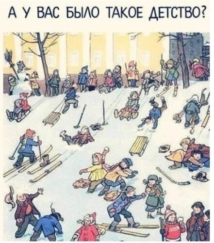 Такое и было. Домой куском льда приходили. Самое лучшее детство всех времен! Кино, лыжи, коньки, ситро "Буратино", бесплатное, замечательное образование,октябрята, пионерия, комсомол, натуральные продукты и человечные люди. Как тепло от вида этой картинки,такие были в ,,веселых картинках " и ,,мурзилке,". И сейчас дети катаются с горки,и толпой и всяко,приходят так что варежки колом стоят,но вот гаджеты это да,зависимость такая у детей,не успели глаза открыть утром уже с планшетом в руках. Да, ни что не сравнится с нашим Советским детством.