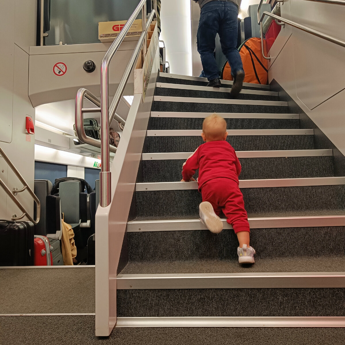 В нашем случае, мы уезжали вечером, когда наступили сумерки, поэтому наше развлечение было бегать за сыном. А в движущемся вагоне это было вдвойне веселее.