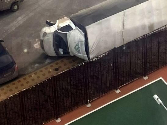По словам горожан, ураганный ветер снес припаркованный в районе жилых домов грузовик. Из-за усиления ветра многотонное авто опрокинулось на бок.