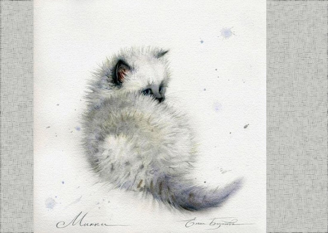 А с рисунка на него смотрело милейшее создание. Нечто рыже-полосатое с довольно большими и любопытными глазками. Котенок был нарисован несколько необычно. По своему обыкновению Господь рисовал котят сидящих анфас, лапочка в лапочке, если окрас однотонный и боком, если окрас цветной. Но при этом мордочка всегда все равно была обращена к Богу. А тут на первом плане как бы попа. Котенок стоит боком, выставив вперед свою попку. А хвост, маленький хвост-морковка почему то закручен в бублик, но не как у собак, а в другом направлении. Прям на самом деле ручка как у кружки… - вдруг заметил и засмеялся Бог, вспоминая как давеча рассуждал сам собою о хвостах и попах с ручками. Вот это ручка! Самая настоящая.