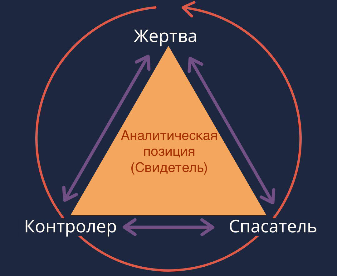 Раз уж было упомянуто спасение, давайте обратимся к модели драматического треугольника Карпмана, чтобы еще лучше рассмотреть усилие по поддержанию нейтральной и парящей, но одновременно эмпатичной аналитической позиции. Наше место - в центре треугольника, и основная задача - не попасть в один из углов (Спаситель, Преследователь, Жертва), так как перенос всегда происходит в рамках этой модели (рис.1). Считайте это психоаналитическим футболом, где аналитик - вратарь, а мяч внимания не должен залететь ни в одни из трёх ворот. Это возможно только при расслабленном (лучшая концентрация достигается именно в расслаблении, а не в напряжении, как кажется) наблюдении за мячом внимания. Это означает преодоление контрсопротивления аналитика, которому по-человечески также тяжело долго выдерживать неопределенность наблюдения и порой хочется завершить тайм, а иногда и игру и получить облегчение отождествлением с ролью. Симптомами поглощения контрпереносом служат разыгравшиеся в душе страсти, желание взять на себя слишком много и исправить жизнь пациента, садистические отклики в ответ на призыв Жертвы и вина впоследствии, неспособность переводить агрессию на себя и признавать свою ответственность за процесс, а также приступы выученной беспомощности и бессилия. Но личность - этот инструмент наблюдения по Салливану - это, кажется, нечто за рамками заданных ролей и именно потому обладающее свободой пересмотра и изменения. По инструкции Биона, мы идем в кабинет без памяти и желания, и только тогда можем быть полезны.