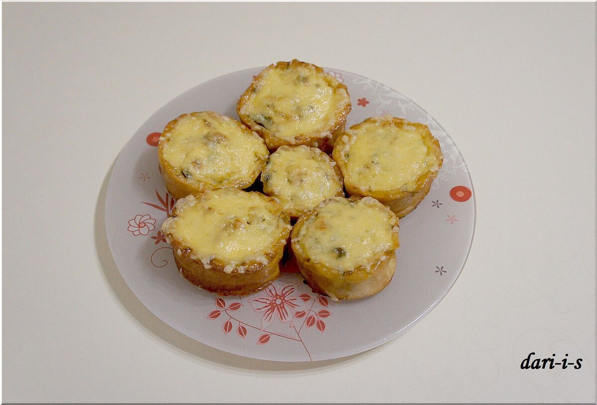 Рецепт я позаимствовала у Анастасии Скрипкиной - кулинарного блогера с большим стажем. Кстати, все рецепты, которые я у неё брала, оказались весьма удачными. Начинка получается прямо нежной, а сами "гнёздышки" - достаточно мягкими. Весьма сытное и очень вкусное блюдо. Улетают как семечки. Нам потребуются (в зависимости от толщины батона выходит от 25 до 35 "гнёздышек"): Лук мелко режем. Обжариваем на растительном масле до золотистого цвета. Сильно зажаривать не надо. Зелень тоже мелко режем. Рыбу нарезаем небольшими кубиками. Хорошо перемешиваем рыбу, жареный лук, зелень, соль, перец и специю. Сыр натираем на мелкой тёрке. Молоко наливаем в глубокую посуду. Батон режем кусочками шириной по 2,5 см. Опускаем кусочки хлеба по очереди в молоко, чтобы они хорошо пропитались им, немного отжимаем. Противень застилаем ковриком для запекания или пергаментом, смазываем растительным маслом. Выкладываем сверху кусочки батона, вымоченные в молоке (можно впритык ставить). В каждом кусочке пальцами