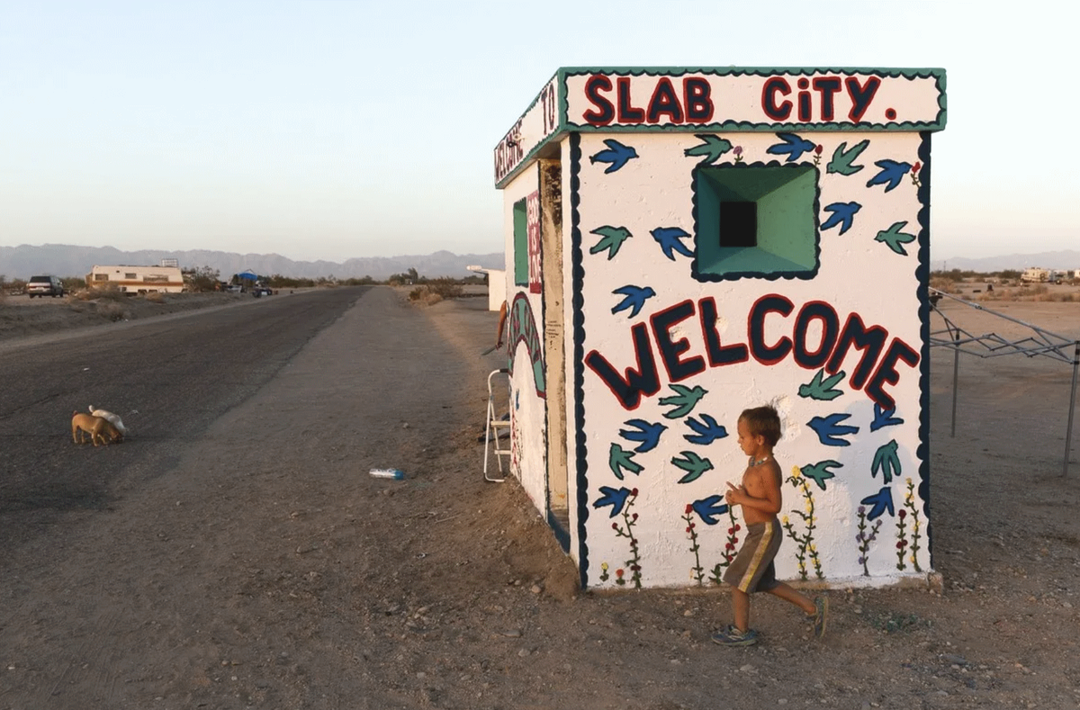 Слэб Сити, возникший в пустыне Колорадо на юго-востоке Калифорнии, стал своеобразным убежищем для небольшого сообщества сквоттеров. Сквоттеры - это люди, которые начинают в домах, на участках, которые юридически им не принадлежат. По сути, это действие по захвату заброшенного или незанятого участка земли или здания, обычно жилого, которым сквоттер не владеет, не арендует или иным образом не имеет законного разрешения на использование. Это пространство (Слэб Сити) привлекает несчастных, отчаявшихся и ярых сторонников личной свободы, предоставляя им, при всей своей уникальности, чувство дома. История Слэб Сити началась как военная база и полигон в 1940-х годах, затем перенесенные десять миль к северу. Звуки стрельбы и воющие койоты вечерами напоминают об истории места. Бывшие военные объекты, такие как бункеры и наблюдательные пункты, оставленные военными, получили название "слэбы", и именно они сейчас составляют архитектурный фон города. Слэб Сити стал домом для нескольких поколений бро