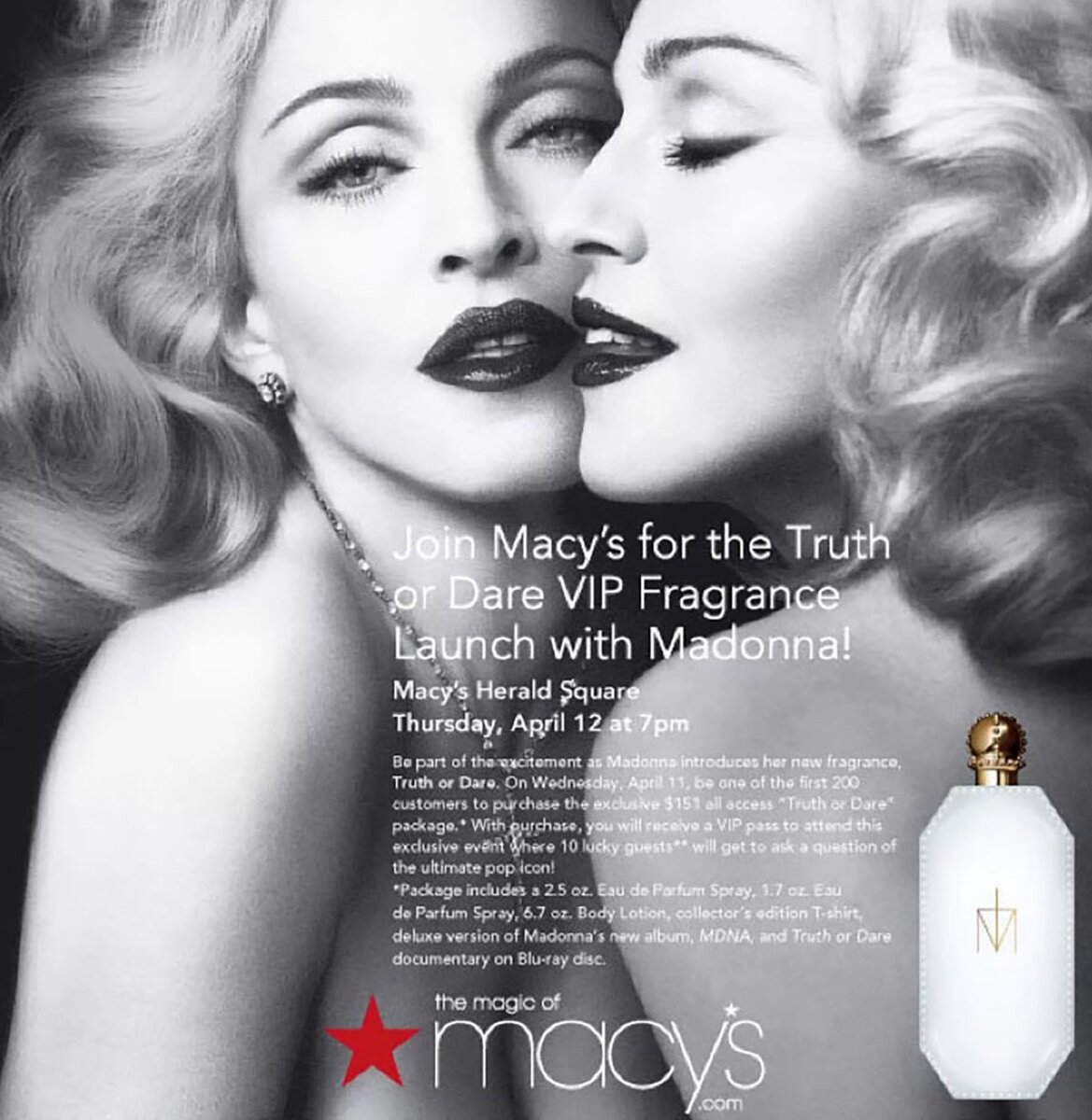 Truth or Dare, Madonna «Я всегда была одержима миром ароматов и на протяжении многих лет мечтала создать что-то очень личное – духи, которые были бы частью меня самой!» Мадонна Возникла идея интерпретировать классическое звучание белых цветов, превратив их в нечто сексуальное и пьянящее, магическое и таинственное. Очень дерзкое, вызывающее и провокационное, смелое и откровенно женственное! Парфюм, по словам основательницы фирмы, поп-звезды Мадонны, призван ассоциироваться со смелостью и честностью. В своем составе Truth or Dare соединяет светлые и темные звуки, современность и ностальгическое прошлое. Truth or Dare - аромат селебрити, который формально относится к бюджетной парфюмерии (в свое время продавался за совсем небольшие деньги), а по смыслу очень выбивается из ряда ароматов знаменитостей. Почему, расскажу ниже. Ныне снятый, но на парфюмерных барахолках найти ещё можно. К ароматам знаменитостей принято относиться, как к баловству и немножко со снисхождением. Ну, вроде как, не