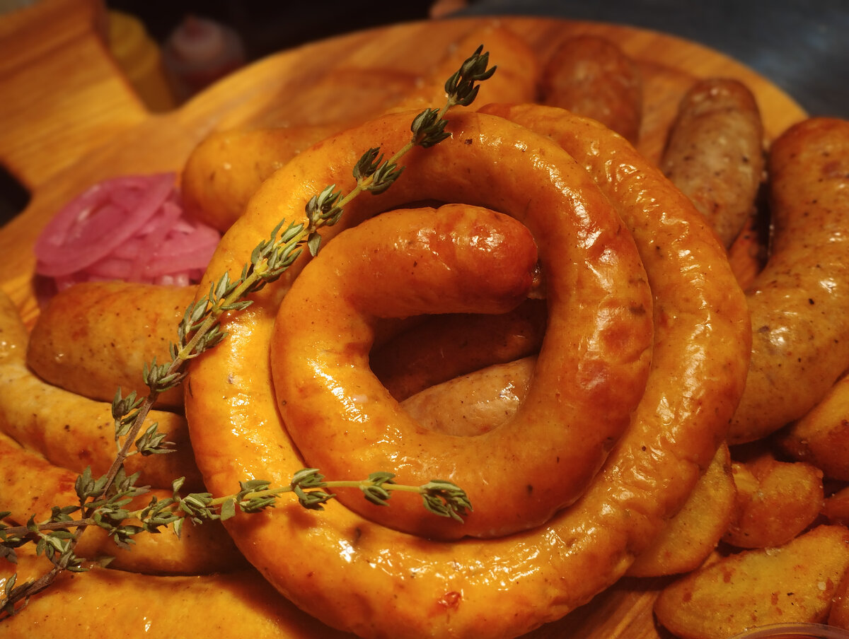 Доброго дня, читатели Дзен! Сегодня готовим ароматные, сочные колбаски! Идеальное сочетание специй и мяса! Для приготовления нам понадобится: - свинина мякоть- 350гр - свинина сало-350гр - филе индейки- 1.300гр - соль- 55 гр -паприка молотая- 15гр - горчичный порошок- 12гр -базилик сушёный- 8гр - каркума- 8гр - чеснок сушёный- 15гр -кориандр молотый- 5гр - перец чёрный молотый- 10гр - перец красный молотый- 10гр - черева баранья - вода-500гр Приготовление: Подготовим череву, её следует тщательно промыть от соли в холодной воде, затем залить тёплой водой и дать постоять пару часов, так черева станет пластичнее. Готовим фарш: Мясо пропускаем через мясорубку два раза, добавляем все специи и воду. Хорошо вымешиваем, добавляем в процессе недостающих специй. Дайте фаршу настоять в холодильнике. Череву можно наполнять через специальную насадку мясорубки, шприцом, через бутылку. Длинную колбаску сворачиваем на порционные улитки, и оставляем в холодильнике на несколько часов. Перед приго