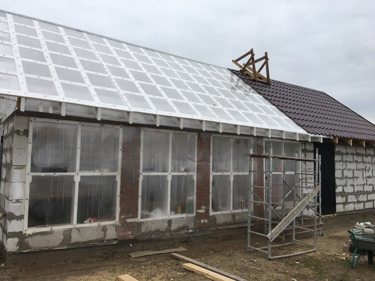 После переезда мы с мужем долго спорили, что строить первым – баню или теплую зимнюю теплицу? Я, конечно, двумя руками голосовала за теплицу, а муж за баню. Он вообще считает, что по-настоящему помыться можно только в баньке, после трех-четырех заходов в парилку. Поэтому битва мнений была жаркой. Но в итоге мы подумали, посчитали и решили, что оба строения можно объединить. Что мы и сделали. На участке кроме дома ничего не было, поэтому начинать стройку можно было с любого угла. Мы решили расположить наш «дуплекс» рядом с домом, чтобы проще было подвести коммуникации. Завели все на общий фундамент глубиной 20 сантиметров в землю и 20 сантиметров над уровнем почвы. Стены выложили из пеноблока. Там, где будет находится баня – стены сплошные с блоковой перемычкой между теплицей. В будущем зимнем саду стены с трех сторон. Под окна оставлена одна стена – там мы сделали три кирпичных столба, между которыми со временем будет остекление. Под крышу заводили армопояс – делали опалубку по верху