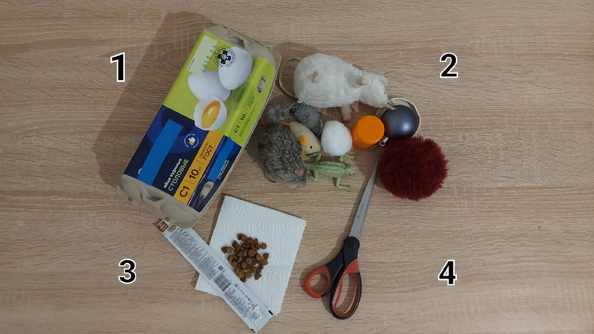 Пошаговая инструкция интересной пищедобывательной игрушки, из того, что есть в доме у каждого. Я уже писала ранее (ссылки прикреплю в конце статьи) о том, как важно играть с кошкой. Причем необходимо, чтобы игры были разнообразными, развивающими, направленными на реализацию разных потребностей кошки. Один из видов игрушек для кошек - интерактивные пищедобывательные игрушки. Их задача - заставить работать кошачий мозг, выращивать новые нейронные сети, развивать логику. Кроме того пищедобывательные игрушки могут помочь с некоторыми расстройствами пищевого поведения, например, когда еда буквально сметается за 2 секунды, а потом выходит обратно. Конфигурации у игрушек абсолютно разные, можно купить готовые и наблюдать, как увлечена кошка, а можно не тратить деньги и сделать одну из таких игрушек самим, не потратив при этом денег, а времени это занимает - 2 минуты. Что нам потребуется: 1.Лоток из-под яиц. 2.Разные мелочи, можно маленькие кошачьи игрушки и предметы, которые вы найдете (