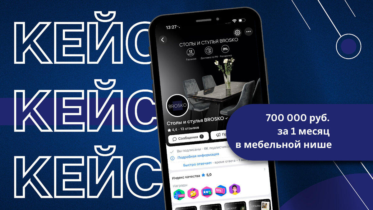 Месяц назад к нам обратилась компания, которая занимается продажей столов и стульев - BROSKO. Мы с радостью взялись за проект и начали подготовку! Сделали упаковку сообщества, разработали дизайн визитки, настроили чат-бот для удобной и быстрой обработки заявок, прописали контент-план и начали публикацию постов. Параллельно подготовили стратегию продвижения, офферы и креативы для первых рекламных тестов. Очень сильно упрощает работу готовый контент. Заказчик предоставил нам огромное количество фото и видео материалов в отличном качестве. Мы отобрали лучшие и начали тестировать рекламные объявления. Результаты Период: 1 месяц Потраченный бюджет: 148 699 руб. Дневной бюджет: 5000 руб. Количество новых диалогов: 300 Стоимость 1 диалога: 495,6 руб. Выручка: 700 000 руб. ROMI: 370,75% Было запущено 129 объявлений на разные города России. Протестированы 10 аудиторий и все форматы рекламных объявлений: карусель, универсальная запись, запись с кнопкой. Многие объявления набирают высокую позитив