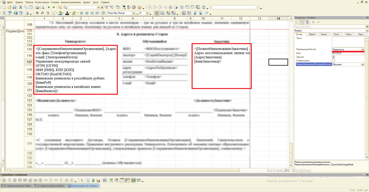 Проблема Столкнулась со следующей проблемой при создании макета печатной формы. Хочу отметить, что в области с проблемными ячейками мной были установлен другой формат строк (ширина столбцов отличается от остального макета). Возможно описываемая мной проблема актуальна только для этого случая. В ячейке макета находится текст с переносами строки. Требуется, чтобы текст в рамках одного "абзаца" переносился автоматически и растягивался по ширине. Но указание в свойстве ячейки РазмещениеТекста - Переносить, как и выбор на панели инструментов выравнивания текста по ширине для отдельной ячейки, не приводят к нужному результату. В выделенных красным областях можно увидеть, что текст скрывается за границей ячейки, а не переносится. Решение Для того, чтобы текст переносился, нужно выделять не конкретные ячейки, а все строки целиком, содежащие такие ячейки. После выделения необходимо выбрать на панели инструментов выравнивание текста по ширине, и вуаля! Текст переносится и выравнивается по ширин