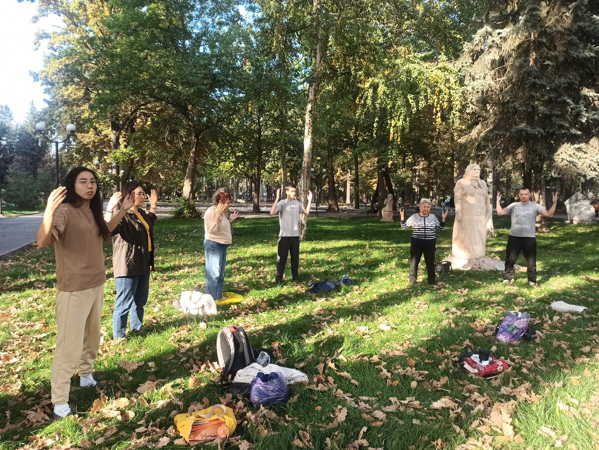 Это было в прошлом году. Иду я значит по парку Ч. Айтматова рядом с Кинотеатром Алла-То, там где стоят каменные статуи. Иду и вижу женщин, стоящих в окружении статуй и делающих что-то интересное, похожее на цыгун. Я подошëл и спросил что это такое и сколько стоят занятия. Так я познакомился Гульмирой эже. Гульмира объяснила про Фалунгун, сказала что занятия бесплатные и дала почитать брошюры. Я спросил Гульмиру, похоже ли то, что они делают на тайцзы, она сказала, что да, похоже, но их практика мощнее чем тайцзы, тайцзы нужно долго учиться, а тут прогресс возникает очень стремительный, быстрее чем в других школах.